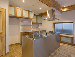 住居側のスペースは、L字型に配置された使い勝手の良いキッチンスペースです。